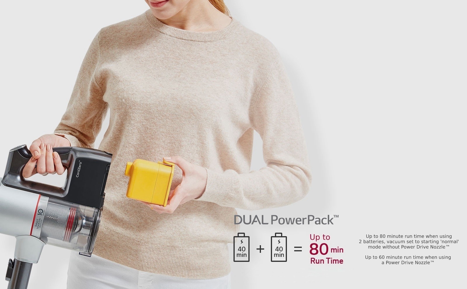 The two lithium-ion batteries in the LG CordZero handstick provide a possible total of a huge 80 minutes’ worth of vacuum time! (When operating in ‘normal’ start mode and without a Power Drive Nozzle™.)