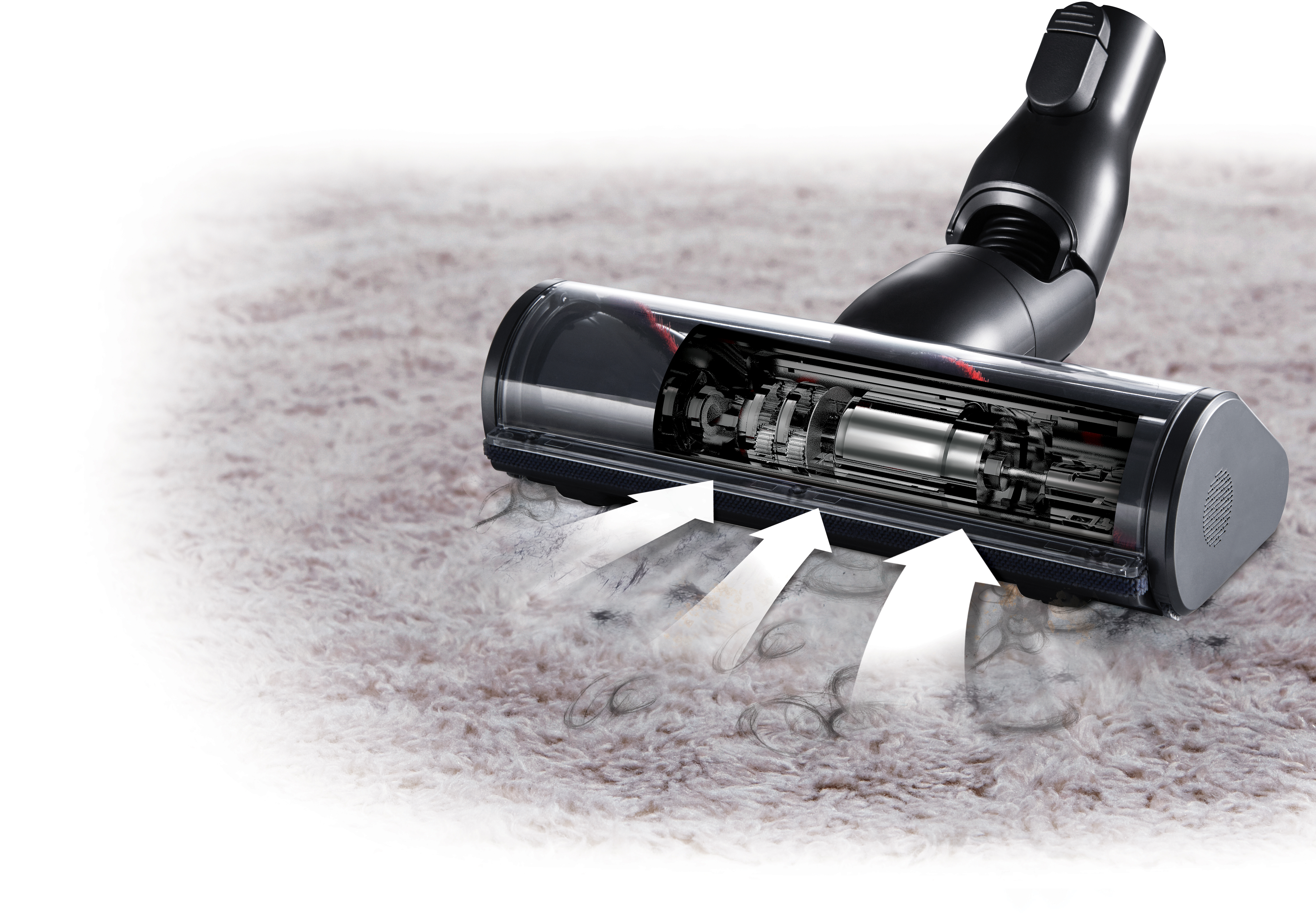 This special motor on the inside of the head rotates the roller so it can effectively clean from any floor surface. It lifts dust, dirt and even pet hair from carpets and off hard floors. Watch the short clip below to see it in action!